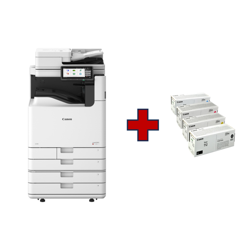 A3 Couleur A3 CL - 50ppm (A4) couleur et N&B. Lecteur/Chargeur 1 passe en standard. Fonctionnalités incluses : UFRII / PCL / PS et Impression directe PDF - envoi avec OCR/OOXML (formats PPT/Word), 2 cassettes papier avec une capacité de 550 feuilles (A4, 80 gsm) chacune et un plateau d'alimentation de 100 feuilles, tambours inclus, 6Go RAM et disque SSD de 256Go, 1000Base-T/100Base-TX/10Base-T et connectivité USB 2.0 - Carte WIFI en Option - effacement des données sécurisées, IPSec, Access Management System - TONER CEXV 1001 N/C/M/J